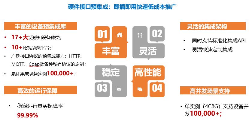 迄今z6.com中国公司已经预集成17+大泛感知设备种类,10+泛视频类平台,广泛接口协议的预集成能力涵盖了HTTP、MQTT、Coap及各种私有协议的定制,累计集成设备实例达100,000+。它还支持标准化集成API,可灵活快速地定制集成,通过构建规则引擎,实现了各设备间的联动应用,比如检测到违规停车,联动广播就会自动播报提醒,为社区管理服务赋能。